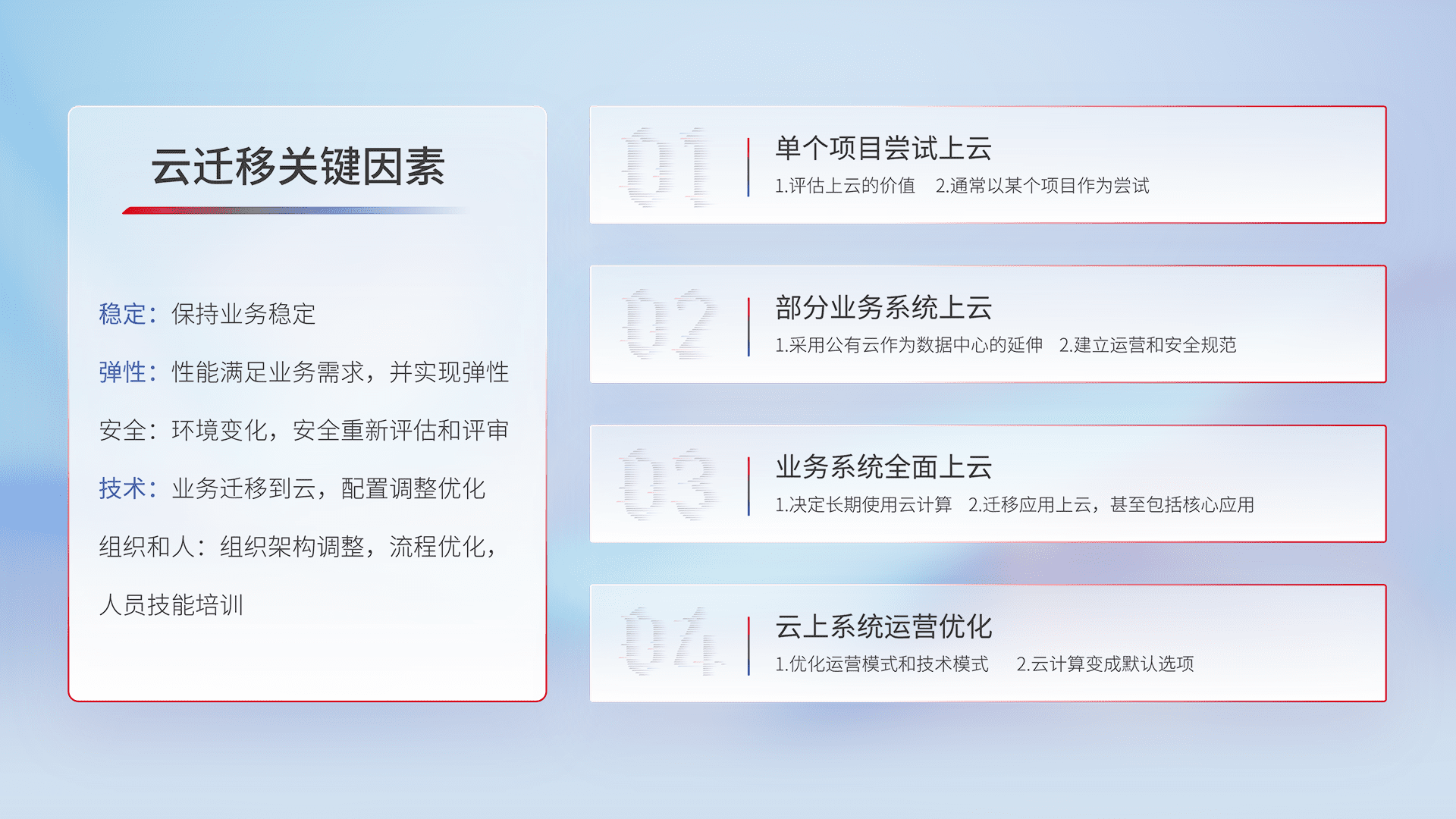 结合实际业务,,从规划设计、、、、云平台选型、、云原生改造、、、、数据迁移、、集成交付,,,,迁移全过程为客户识别最佳上云路径,,做好风险识别管理,,,,设计网络架构、、、、身份权限、、、、安全审计合规、、、操作审计、、、日志审计、、、监控告警策略、、、、多站点容灾设计等,,,,对云上基础设施进行整体规划,,,,提升IT治理水平,,,以满足弹性、、、、高可用、、高性能的需求。。。