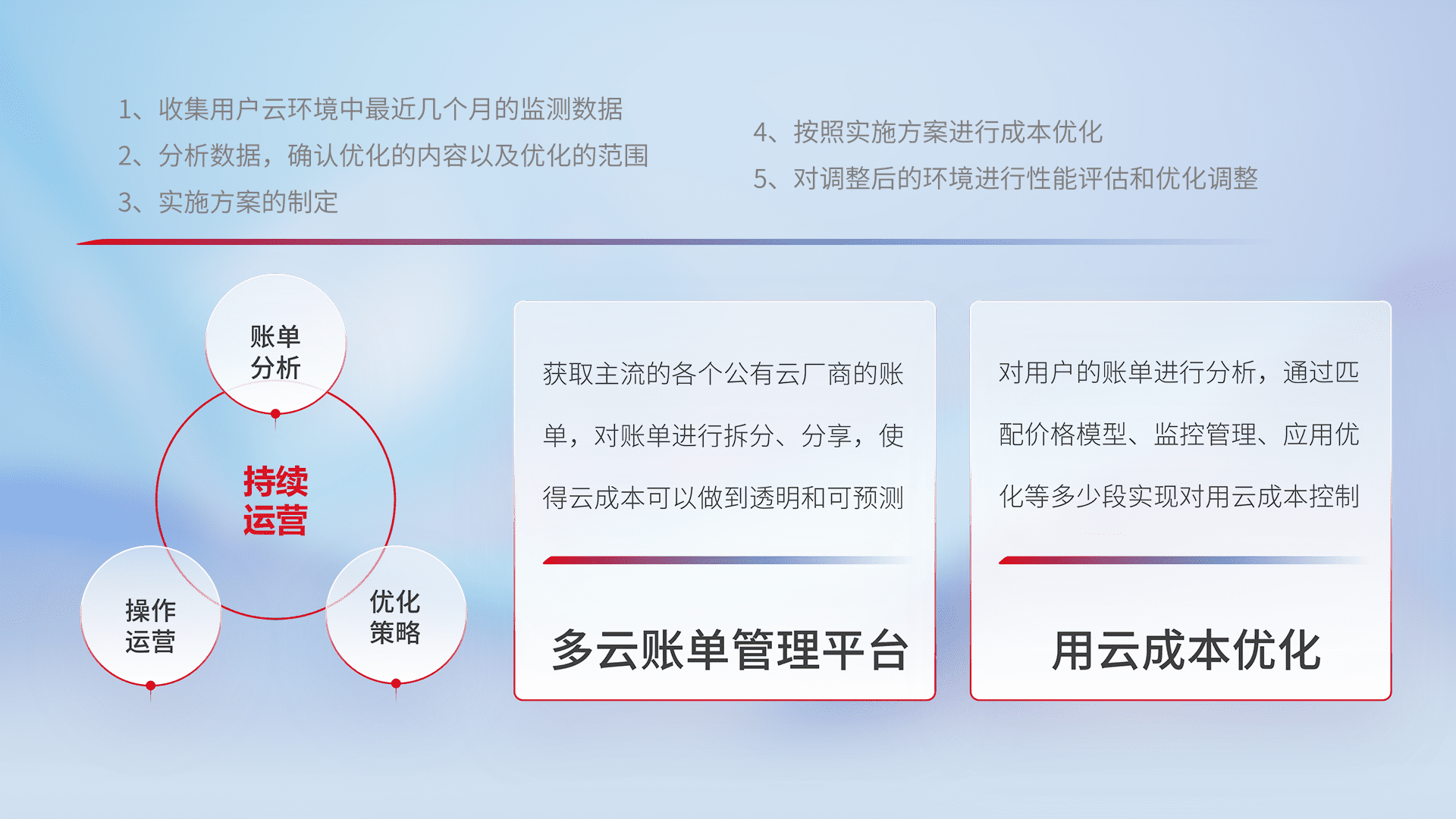 通过多云纳管,,以统一的资源数据模型把客户的云资源进行抽象和封装,,,,进而实现对多云资源的统一操作,,保障云资源管理的可靠性、、稳定性与可用性。。。量身定制化运维内容,,,,配置、、、开发运维、、、补丁管理、、备份、、、监控、、认证和访问管理、、、审计和日常巡检等,,,保障在用云过程中的可靠度,,稳定度以及高可用率。。。
